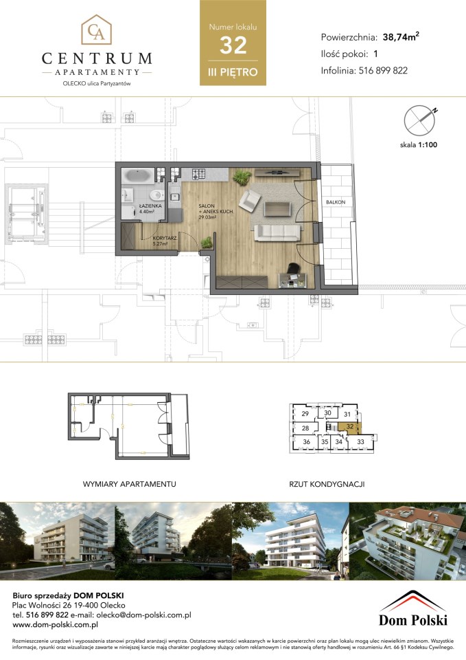 Oferujemy na sprzedaż mieszkanie nr 32 o powierzchni 38,74 m2. Lokal mieszkalny zlokalizowany jest na trzecim piętrze budynku w inwestycji Centrum Apartamenty przy ul. Partyzantów w Olecku. Składa się z salonu z aneksem kuchennym (29,03 m2), korytarza (5,27 m2) oraz łazienki (4,40 m2). Do mieszkania przynależy taras oraz komórka lokatorska. W mieszkaniu jest możliwość wydzielenia oddzielnej sypialni o powierzchni około 10 m2.