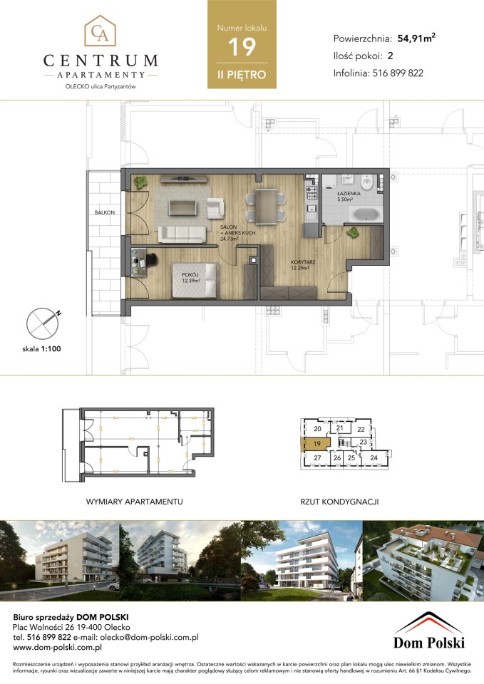 Oferujemy na sprzedaż dwupokojowe mieszkanie nr 19 o powierzchni 54,91 m2. Lokal mieszkalny zlokalizowany jest na drugim piętrze budynku w inwestycji Centrum Apartamenty przy ul. Partyzantów w Olecku. Składa się z salonu z aneksem kuchennym (24,73 m2), sypialni (12,39 m2), korytarza (12,29 m2) oraz łazienki (5,50 m2). Do mieszkania przynależy duży taras o powierzchni około 8,5 m2.
