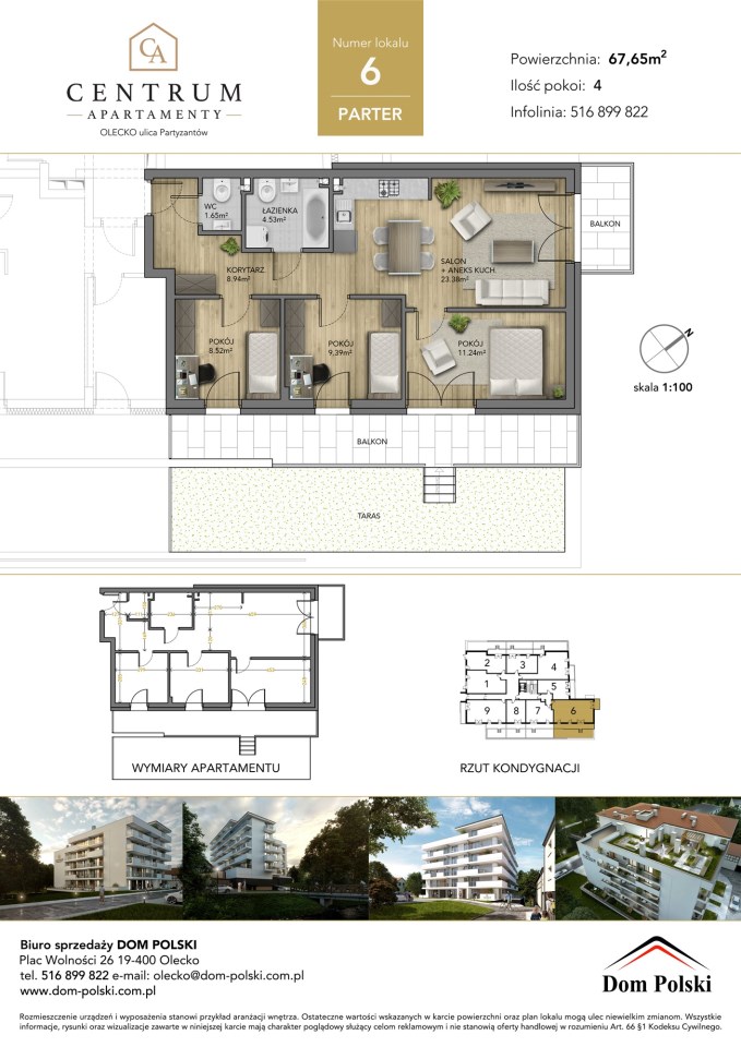 Oferujemy na sprzedaż 4-pokojowe mieszkanie nr 6 o powierzchni 67,65 m2. Lokal mieszkalny zlokalizowany jest na parterze budynku w inwestycji Centrum Apartamenty przy ul. Partyzantów w Olecku. Składa się z salonu z aneksem kuchennym (23,38 m2), trzech pokoi (11,24 m2, 9,39 m2 i 8,52 m2), korytarza (8,94 m2) oraz łazienki (4,53 m2) i WC (1,65 m2). Do mieszkania przynależą dwa tarasy, jeden z zielonym ogródkiem oraz drugi z widokiem na rzekę.