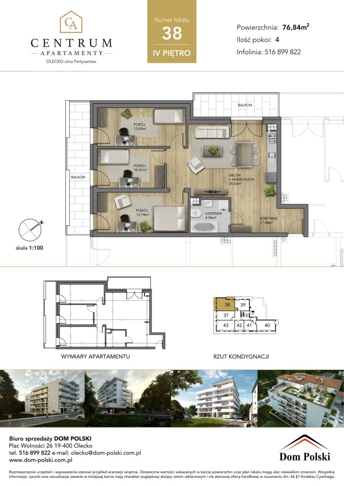 Oferujemy na sprzedaż 4-pokojowe mieszkanie o powierzchni 76,84 m2. Lokal mieszkalny zlokalizowany jest na czwartym piętrze budynku w inwestycji Centrum Apartamenty przy ul. Partyzantów w Olecku. Składa się z salonu z aneksem kuchennym (24,62 m2), trzech pokoi (12,83 m2, 10,01 m2, 13,74 m2), korytarza (11,08 m2) oraz łazienki (4,56 m2). Do mieszkania przynależą dwa tarasy oraz komórka lokatorska.