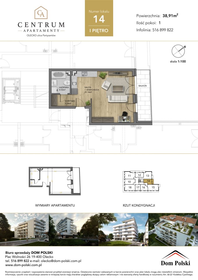 Oferujemy na sprzedaż mieszkanie nr 14 o powierzchni 38,91 m2. Lokal mieszkalny zlokalizowany jest na pierwszym piętrze budynku w inwestycji Centrum Apartamenty przy ul. Partyzantów w Olecku. Składa się z salonu z aneksem kuchennym (29,14 m2), korytarza (5,24 m2) oraz łazienki (4,53 m2). Do mieszkania przynależy taras oraz komórka lokatorska. W mieszkaniu jest możliwość wydzielenia oddzielnej sypialni o powierzchni około 10 m2.