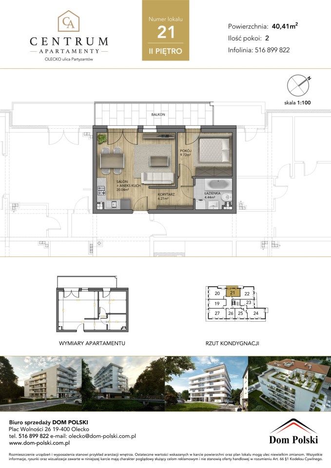 Oferujemy na sprzedaż dwupokojowe mieszkanie nr 21 o powierzchni 40,41 m2. Lokal mieszkalny zlokalizowany jest na drugim piętrze budynku w inwestycji Centrum Apartamenty przy ul. Partyzantów w Olecku. Składa się z salonu z aneksem kuchennym (20,04 m2), sypialni (9,72 m2) korytarza (6,21 m2) oraz łazienki (4,44 m2). Do mieszkania przynależy duży taras o powierzchni 12 m2.