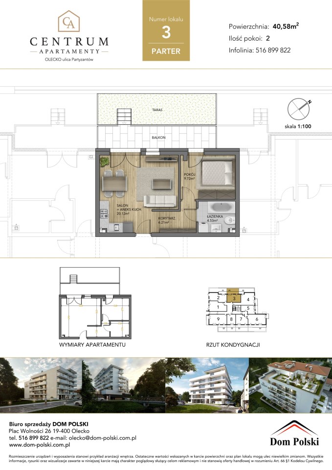 Oferujemy na sprzedaż dwupokojowe mieszkanie nr 3 o powierzchni 40,58 m2. Lokal mieszkalny zlokalizowany jest na parterze budynku w inwestycji Centrum Apartamenty przy ul. Partyzantów w Olecku. Składa się z salonu z aneksem kuchennym (20,12 m2), sypialni (9,72 m2), korytarza (6,21 m2) oraz łazienki (4,53 m2). Do mieszkania przynależy taras z własnym ogródkiem oraz komórka lokatorska.