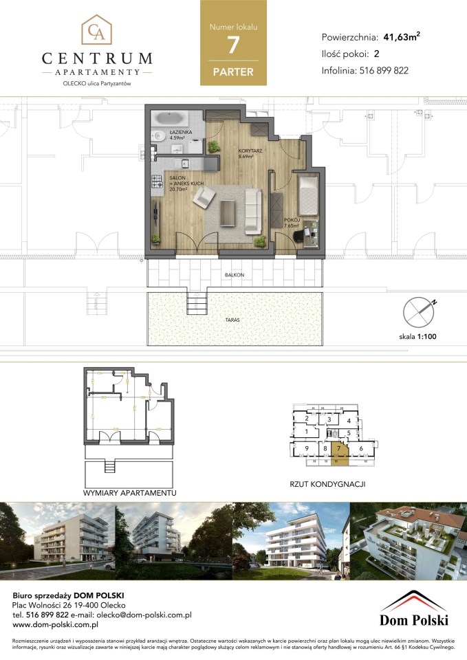 Oferujemy na sprzedaż 2-pokojowe mieszkanie o powierzchni 41,63 m2. Lokal mieszkalny zlokalizowany jest na parterze budynku w inwestycji Centrum Apartamenty przy ul. Partyzantów w Olecku. Składa się z salonu z aneksem kuchennym (20,70 m2), sypialni (7,65 m2), łazienki (4,59 m2) oraz korytarza (8,69 m2). Do mieszkania przynależy duży taras z zielonym ogródkiem.