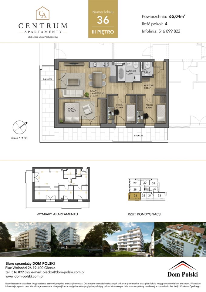 Oferujemy na sprzedaż 3-pokojowe mieszkanie o powierzchni 65,04 m2. Lokal mieszkalny zlokalizowany jest na trzecim piętrze budynku w inwestycji Centrum Apartamenty przy ul. Partyzantów w Olecku. Składa się z salonu z aneksem kuchennym (21,07 m2), trzech pokoi (12,14 m2, 8,10 m2 i 8,52 m2), łazienki (4,28 m2), WC (1,45 m2) oraz korytarza (9,44 m2). Do mieszkania przynależy duży taras oraz komórka lokatorska.