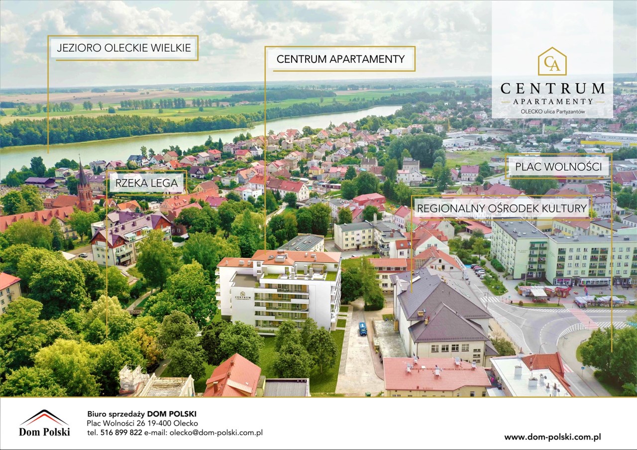 Centrum Apartamenty to jedyna nowa inwestycja położona w ścisłym centrum Olecka. Nowoczesny 5 – piętrowy budynek, w skład którego wchodzi 44 lokali mieszkalnych o powierzchniach od 31 m2 do 86 m2. Mieszkania są funkcjonalne, bardzo dobrze doświetlone dużymi oknami. Prywatne zielone ogródki w mieszkaniach na parterze oraz przestronne tarasy, zagwarantują upragnioną przestrzeń. Na ostatnim piętrze zaplanowano wspólne patio dla wszystkich mieszkańców budynku, z panoramicznym widokiem na miasto oraz Jezioro Oleckie Wielkie. Do każdego mieszkania zaprojektowane są miejsca postojowe w dwupoziomowym parkingu podziemnym. Dostęp do mieszkań z parkingu zapewniony jest poprzez dojście do klatki schodowej z zainstalowaną winą wiodącą na każdą kondygnację. Budynek przystosowany jest do potrzeb osób niepełnosprawnych ruchowo.