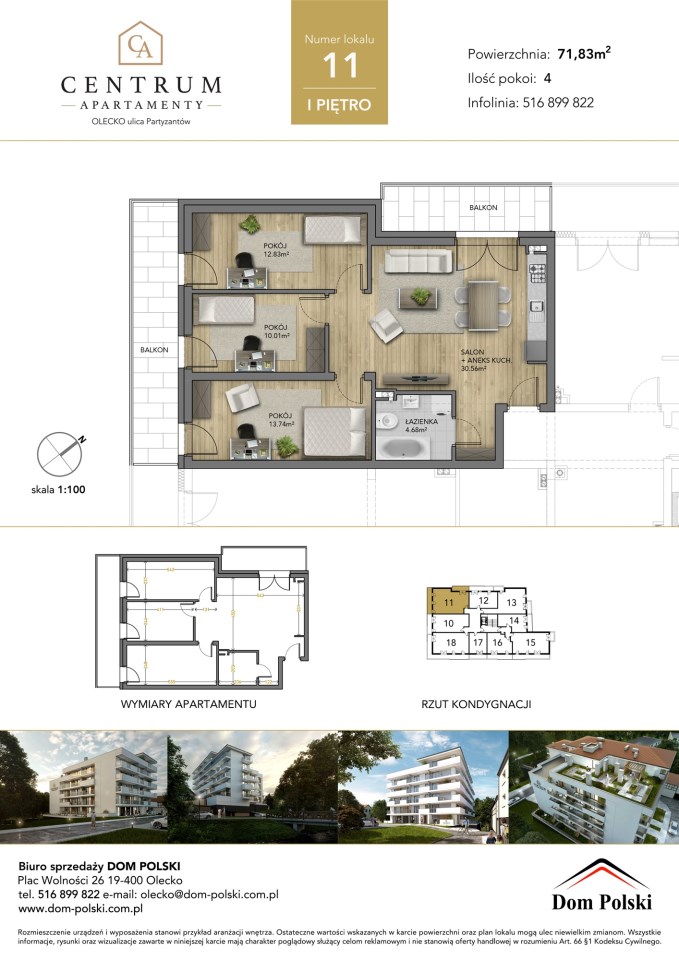 Oferujemy na sprzedaż przestronne, narożne mieszkanie 4-pokojowe o powierzchni 71,83 m2. Lokal mieszkalny zlokalizowany jest na pierwszym piętrze budynku w inwestycji Centrum Apartamenty przy ul. Partyzantów w Olecku. Składa się z salonu z aneksem kuchennym (30,56 m2), trzech sypialni (13,74 m2, 10,01 m2 i 12,83 m2) oraz łazienki (4,68 m2).
